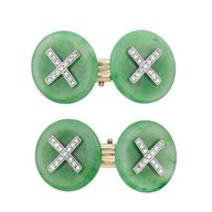 Pair of Art Deco Jade and Diamond Cufflinks Platinum, gold, the 4 jade buttons approximately 18.45 x 18.40 x 3.00 mm. to 18.20 x 18.05 x 2.60 mm., surmounted by rose-cut diamond-set X's, circa 1920.