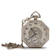 Elgin Art Deco Octagonal Pocket Watch with Chain, Elgin Art Deco octagonal pocket watch, ca 1921. 15-ewel size 12 movement. Illinois Elgin Tivoli case. Serial number 24,756,929. Black enameling on case back. Engraved "AB". Chain marked Simmons.