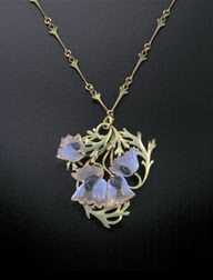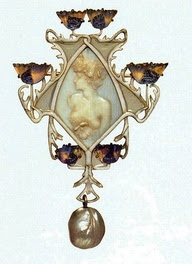 René Lalique. 1900-02 signed 'Female half-Figure' Pendant (Brooch). A shaped pendant with a female head and torso in low relief on the central ivory plaque. The frame is of white-and-lavender glass poppy blossoms whose stems form a symmetrical pattern of beige enamel and gold. A baroque pearl hangs from the base. Calouste Gulbenkian Museum, acquired from the artist in 1901.