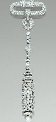 Art Deco  DIAMOND LAPEL WATCH, CIRCA 1925 The bar surmount of circular and baguette diamonds suspending a stylised articulated foliate garland of additional circular-cut stones, the watch concealed by an open work floral motif millegrain-set with circular- and single-cut stones, to the engraved scroll gallery,
